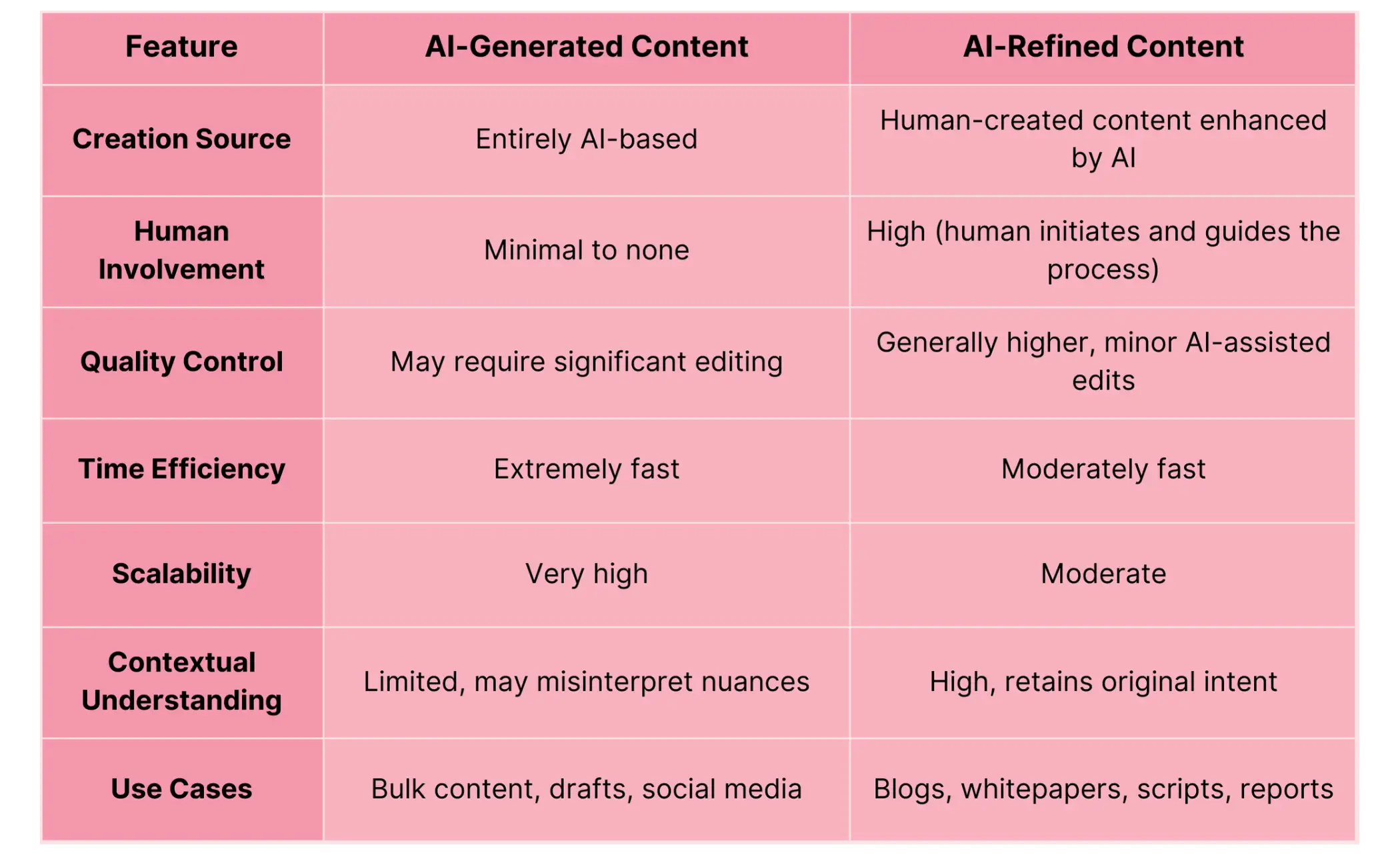 Choosing between AI generated and AI refined content depends on: purpose, target audience, and quality expectations:
