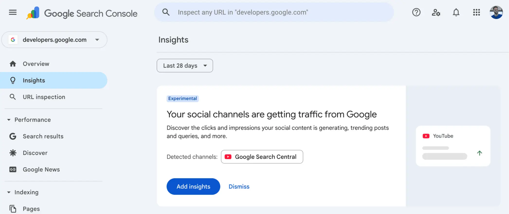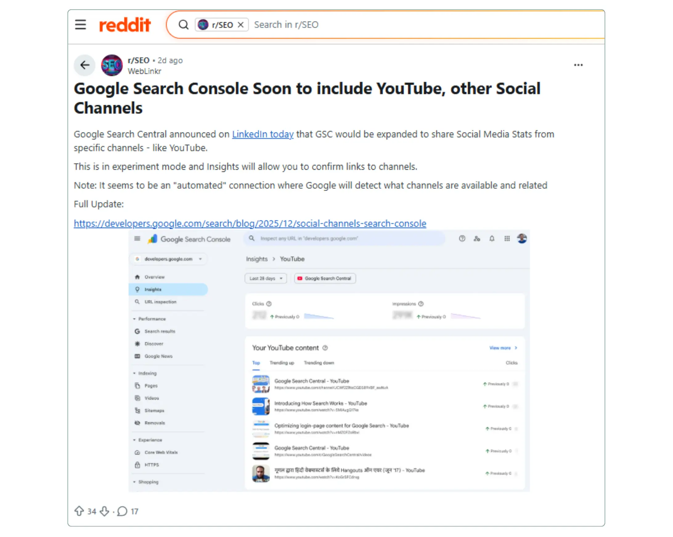 The updated Search Console Insights experience now pulls in performance data from selected social channels automatically associated with your website. This creates a single reporting environment where brands can analyze how searchers discover both their website and their social content.