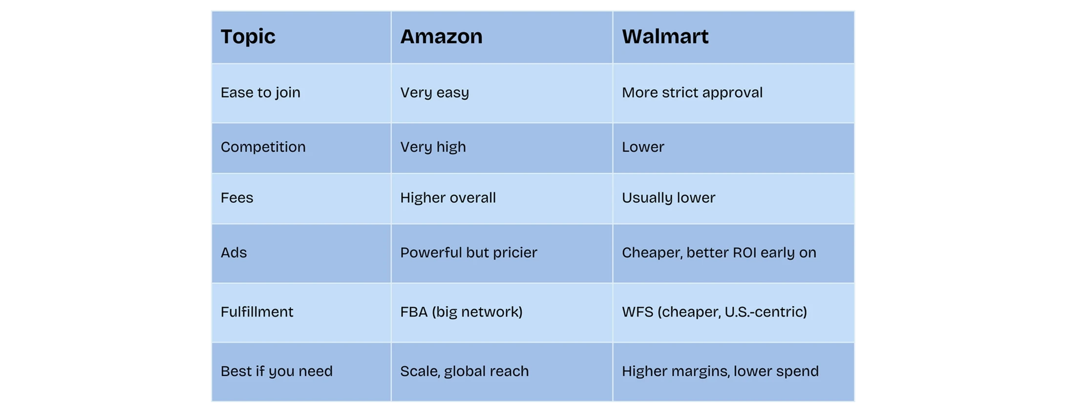 If you want scale and global reach, Amazon marketplace is usually the path. If you want better margins faster and less cutthroat competition, Walmart Marketplace is often the smarter first move.