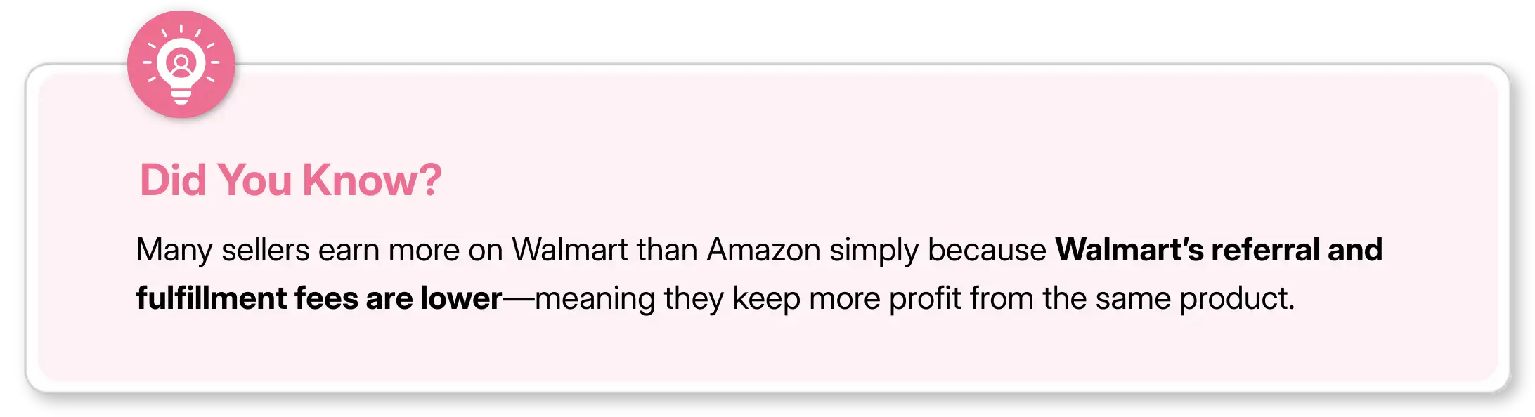 Sellers want to know how much they keep after fees. Walmart usually charges lower referral fees and doesn’t force a monthly subscription, while Amazon has multiple fees (referral + FBA (Fulfillment by Amazon) + storage + subscription). That affects your profit from day one.