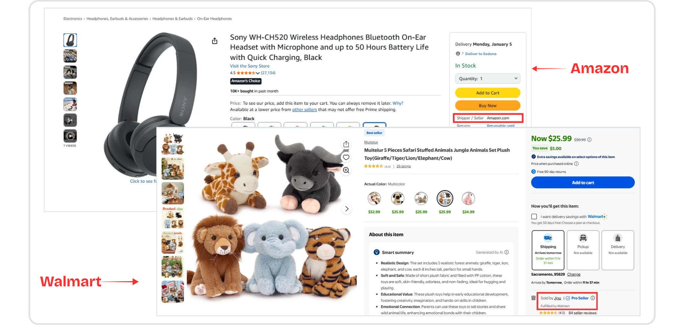 Buy Box = where shoppers click Add to cart. Amazon’s Buy Box is fiercely competitive and depends on price, fulfillment, and seller health. Walmart’s Buy Box is easier to capture because fewer sellers compete on each SKU (Stock Keeping Unit).