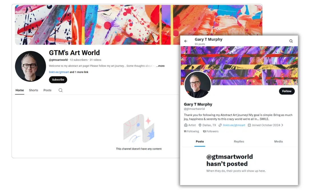 GTM’s Art World, led by artist Gary T. Murphy, is a digital platform dedicated to vibrant abstract art and creative expression. The brand focuses on bringing joy and serenity to audiences through unique visual journeys and artistic storytelling. Gary’s work explores emotional depth and color, aiming to inspire art enthusiasts worldwide.