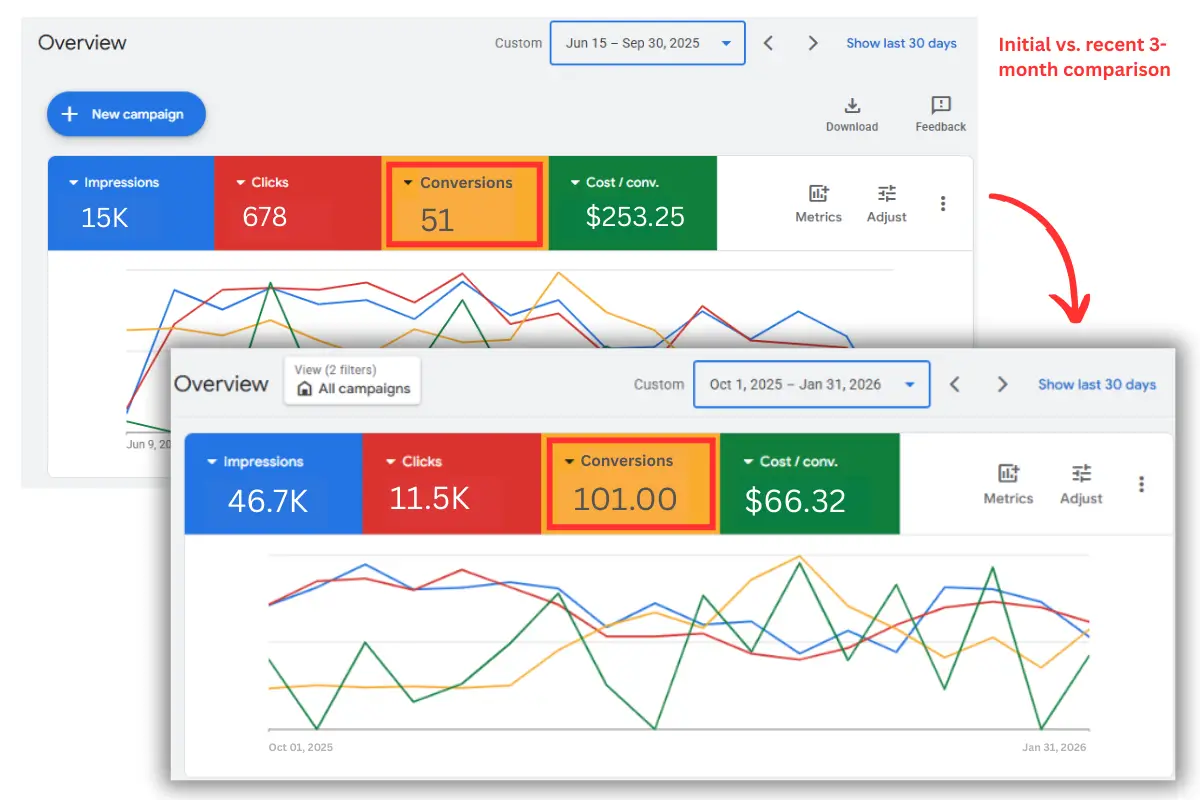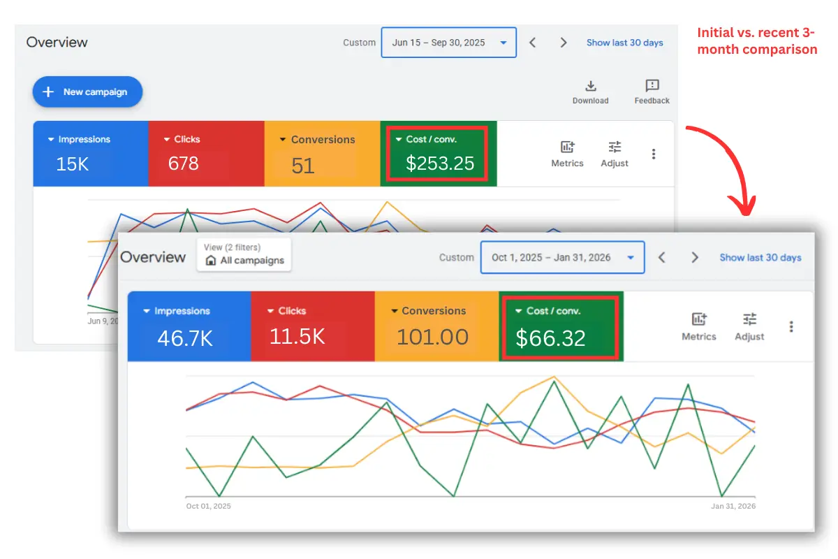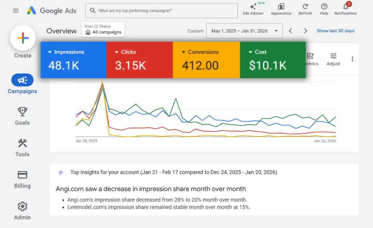 Restructured the campaigns as well as started focusing on Local Service Ads (LSA) to eliminate wasted spend and attract serious homeowners.