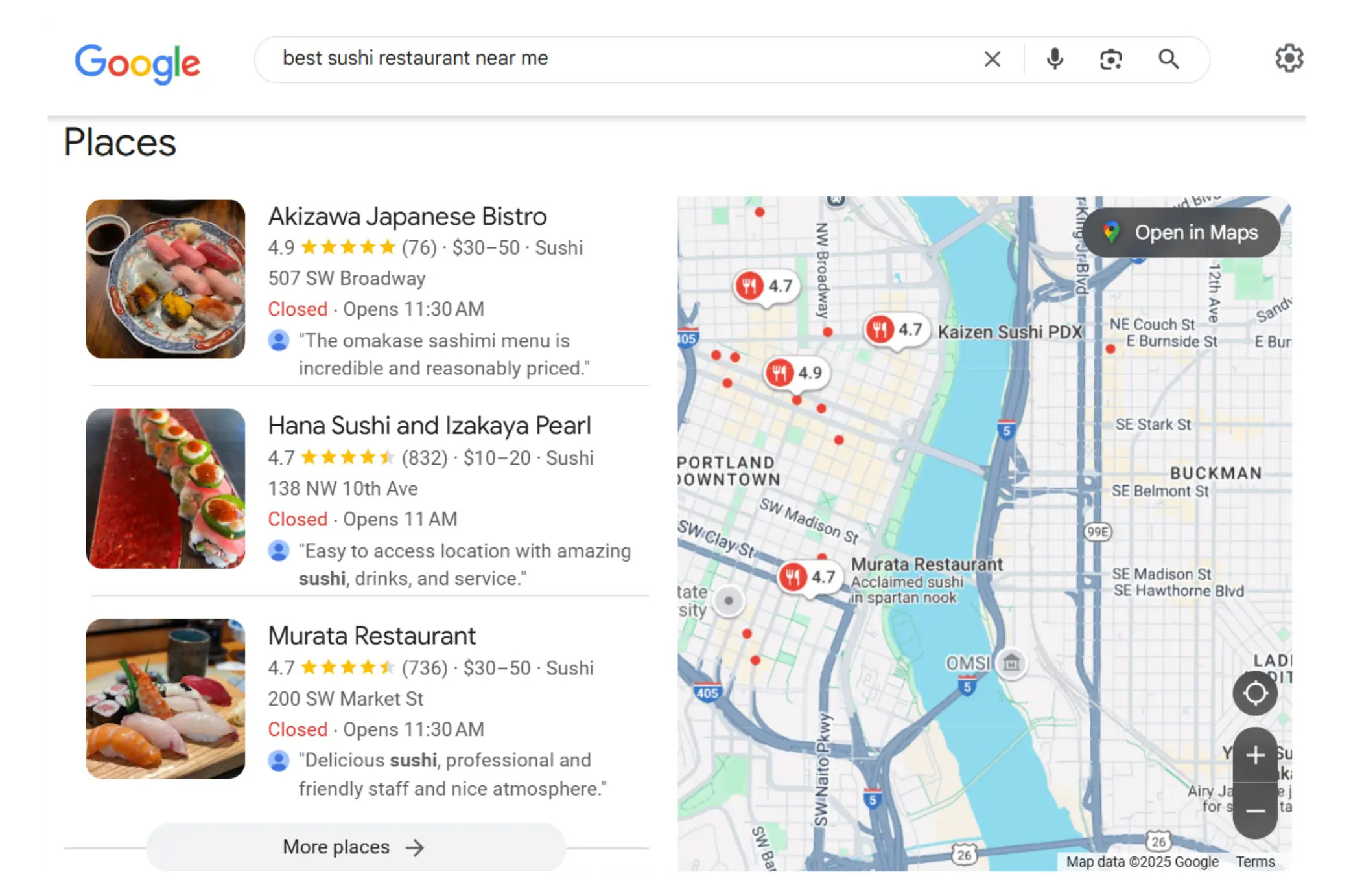 Users can search directly in Google Maps or within Google Search’s local results. Filters like “open now” or “highest rating” change which map points get visibility.