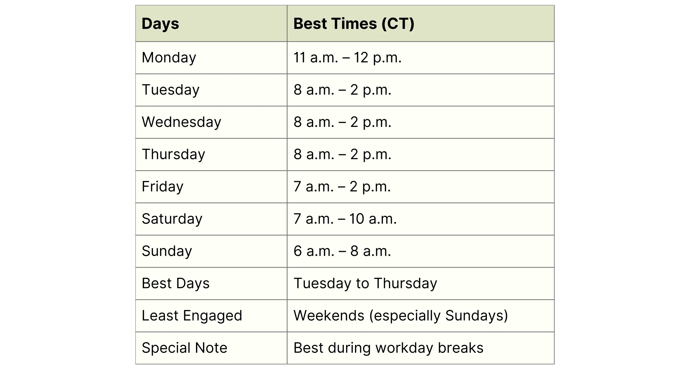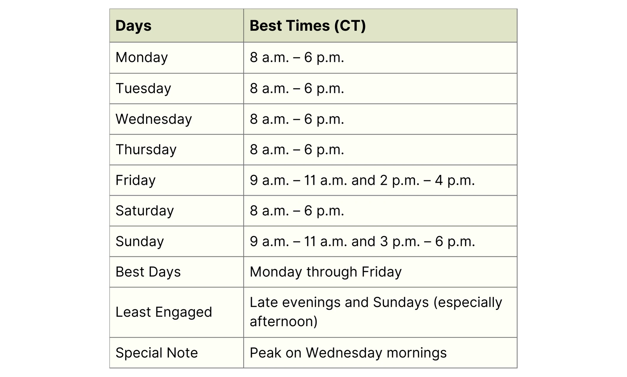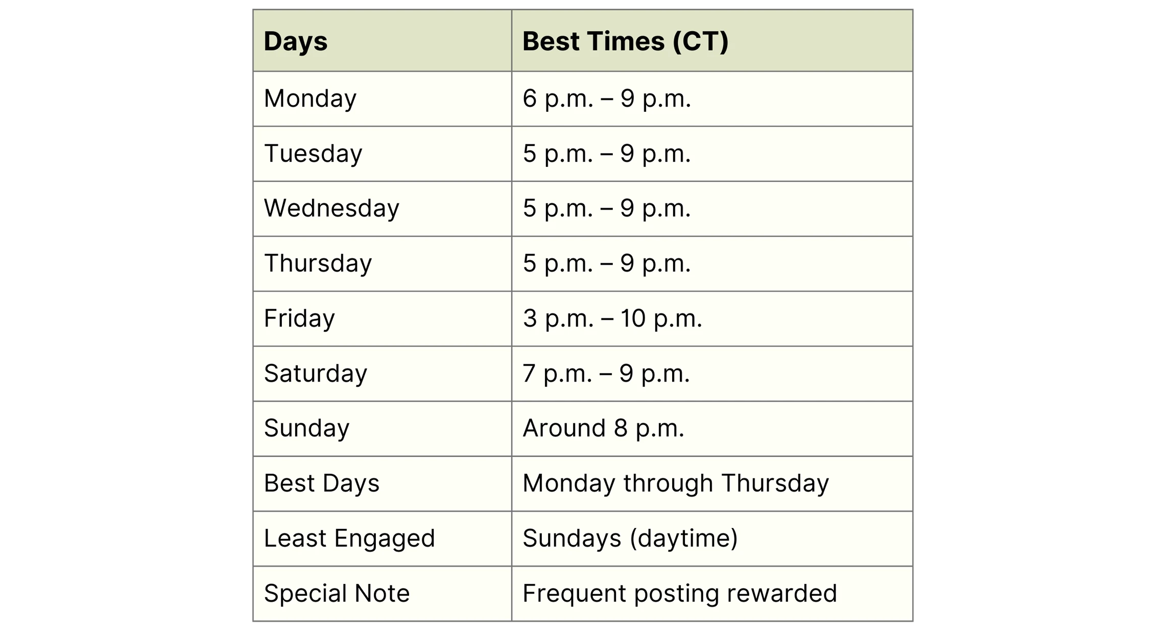 Each platform has its unique best times because its users behave differently. Here are the times that research shows people are most active and engaged in 2026, all converted to Central Time for your ease.