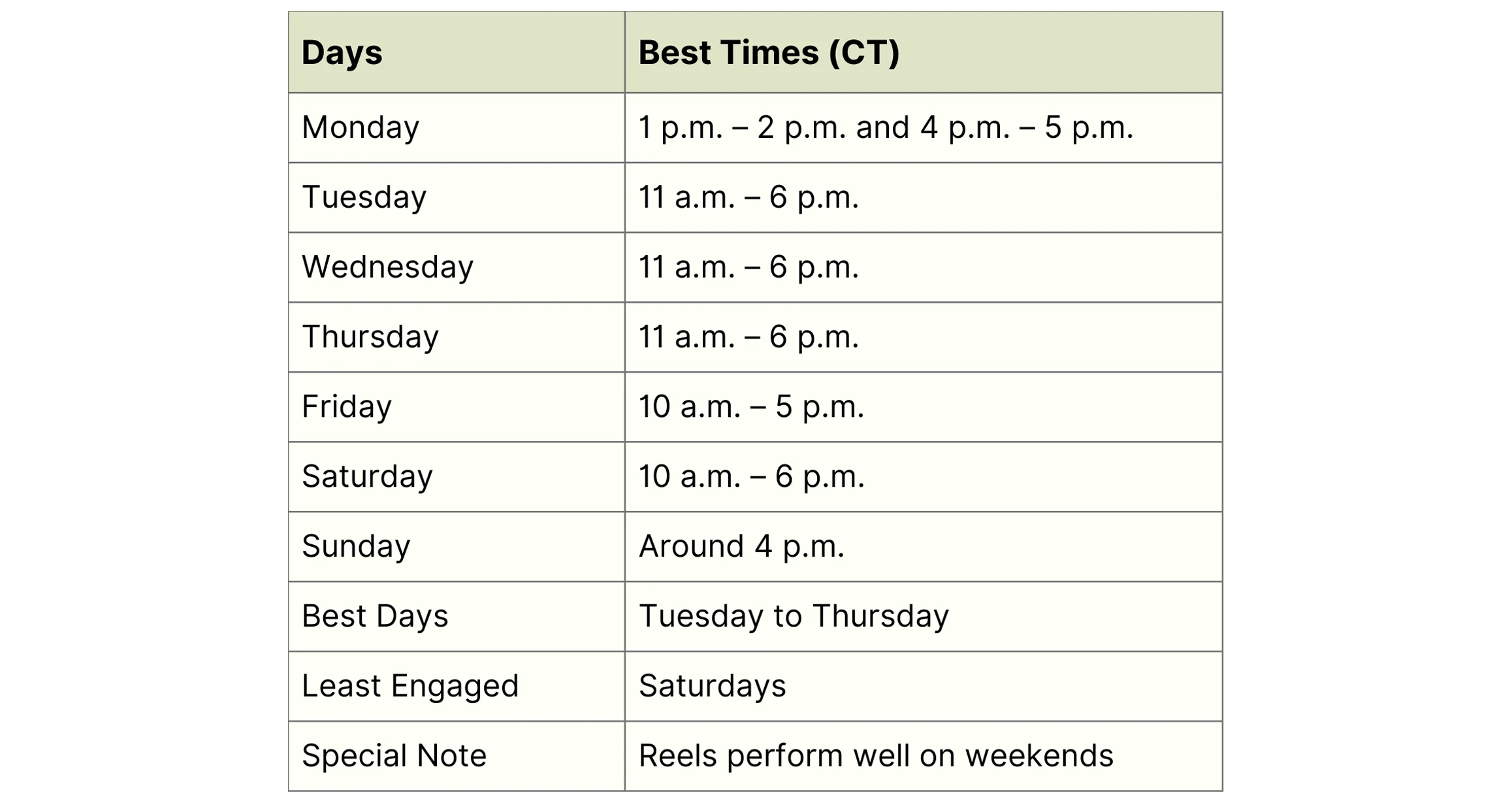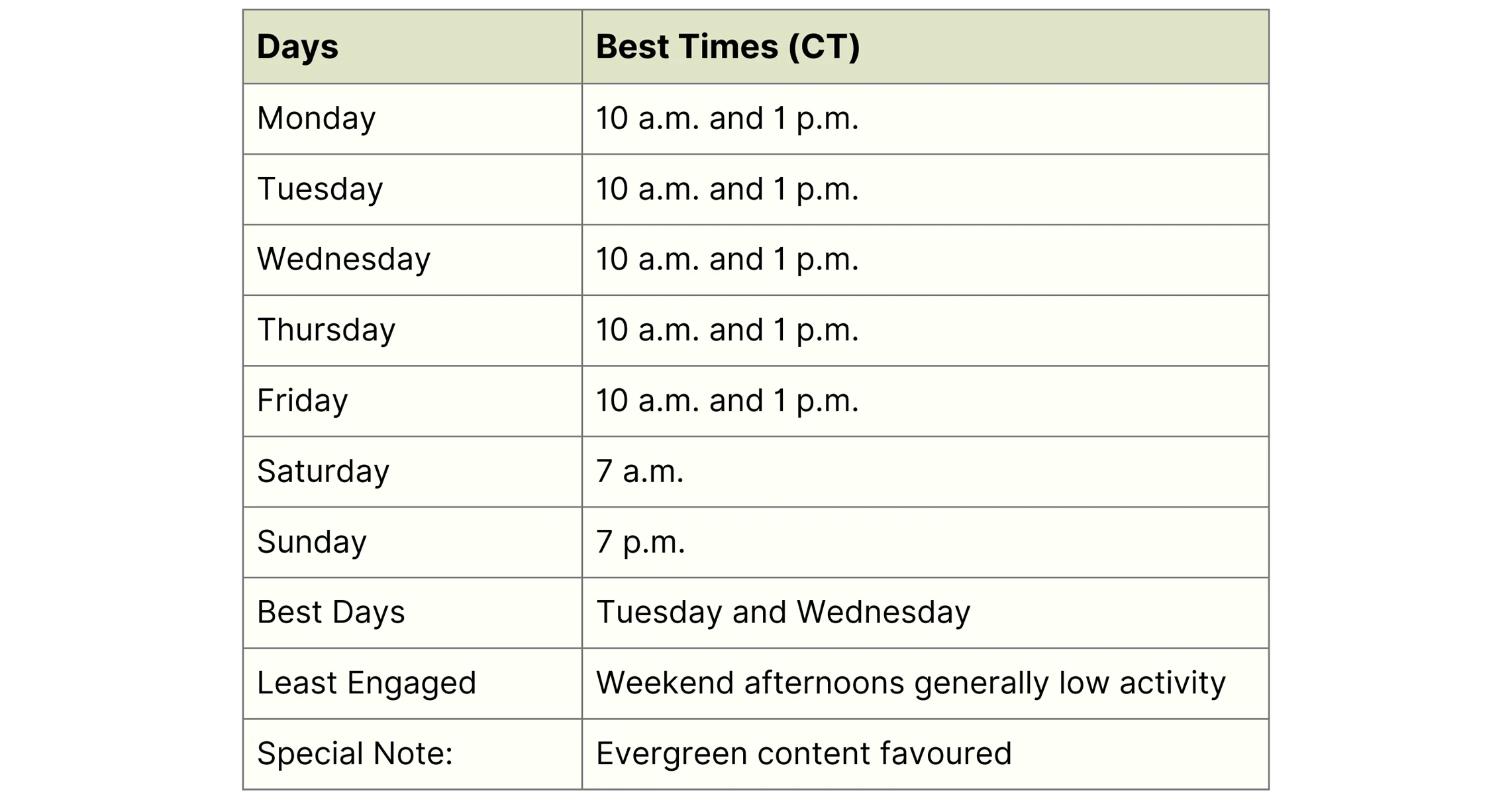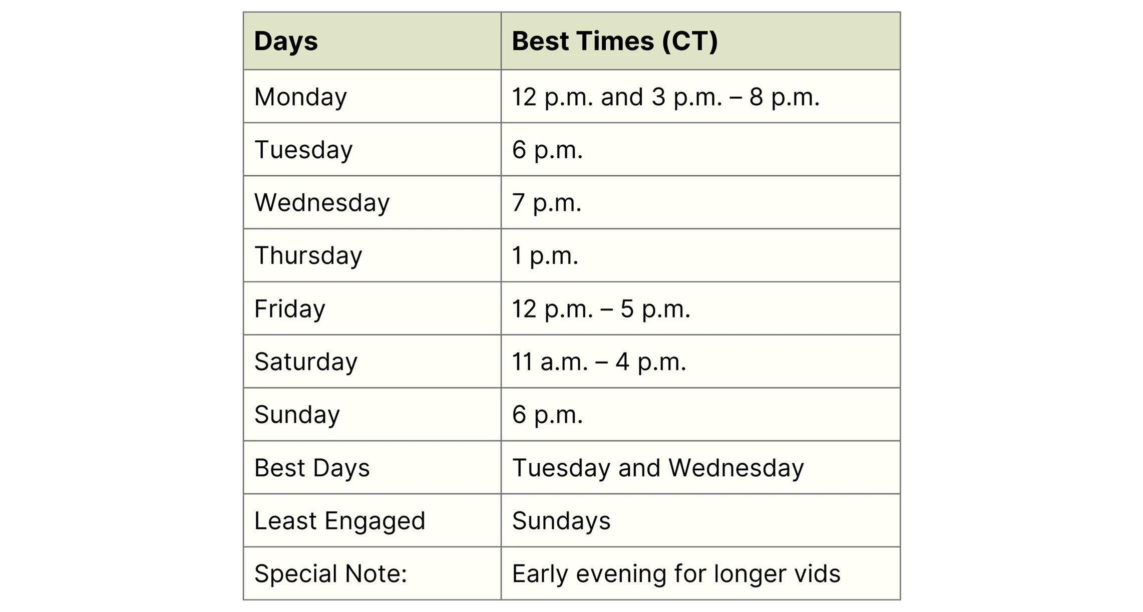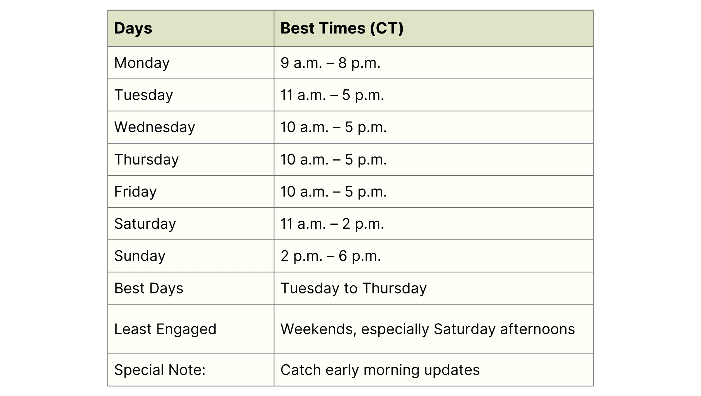 Each platform has its unique best times because its users behave differently. Here are the times that research shows people are most active and engaged in 2026, all converted to Central Time for your ease.