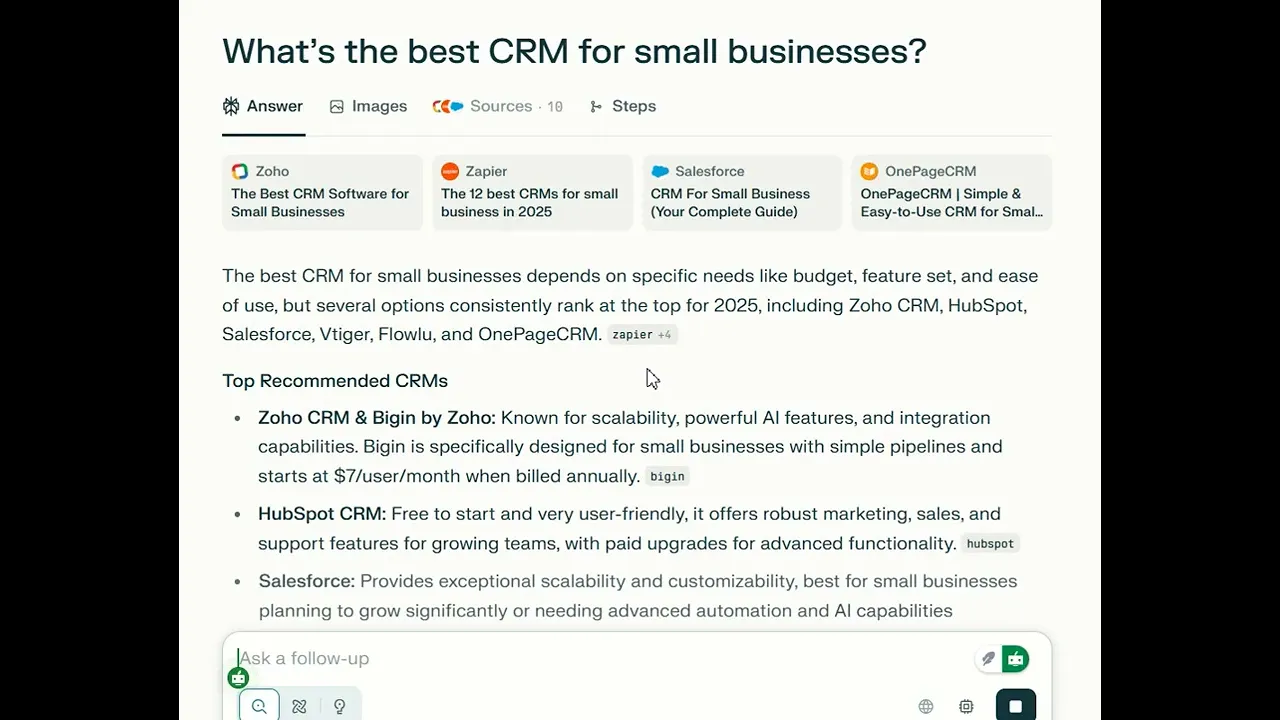 Think about this. A user asks an AI chatbot, “What’s the best CRM for small businesses?”